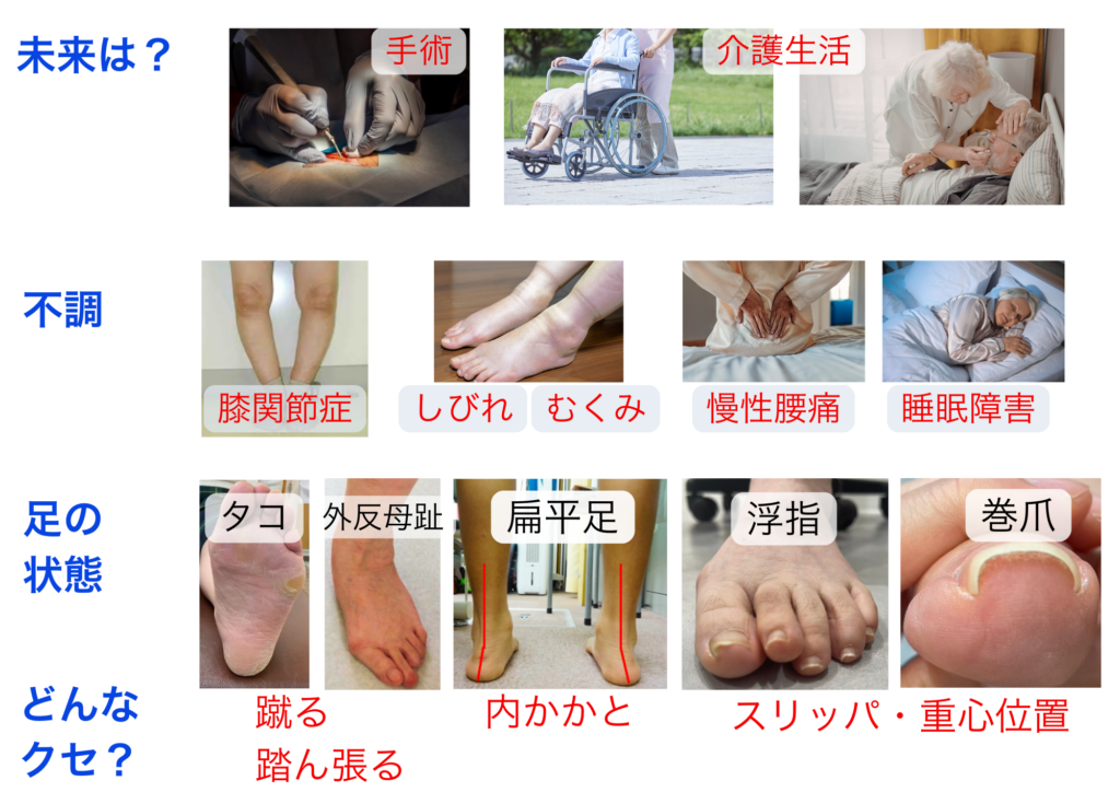 これらの症状に共通する足の機能の低下、足のアライメント崩れが根本原因と考えています。