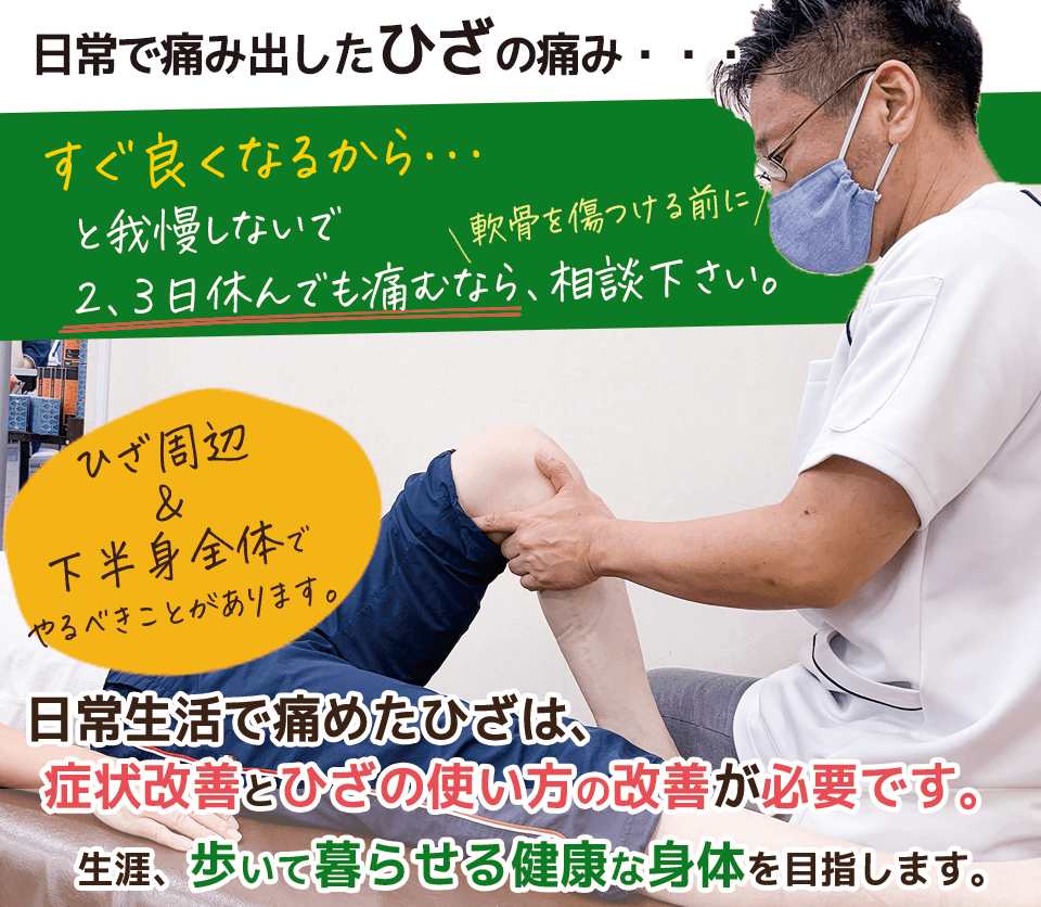 日常生活で痛み出したひざの症状は、同じ日常生活で改善することは難しいことが多いです。
