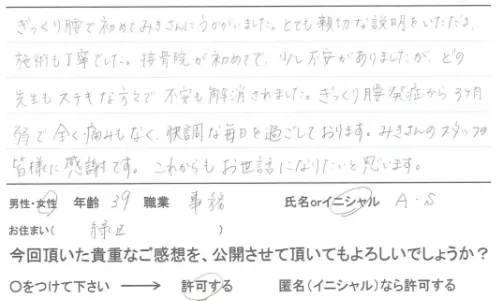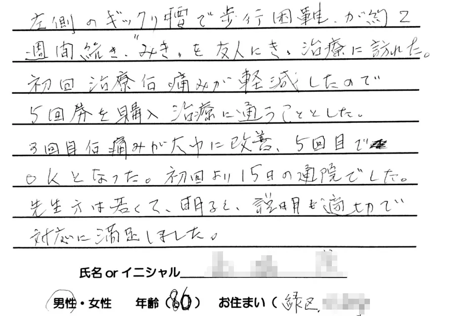 左側のギックリ腰で歩行困難が約2週間続き、”みき”を友人に聞き治療に訪れた。