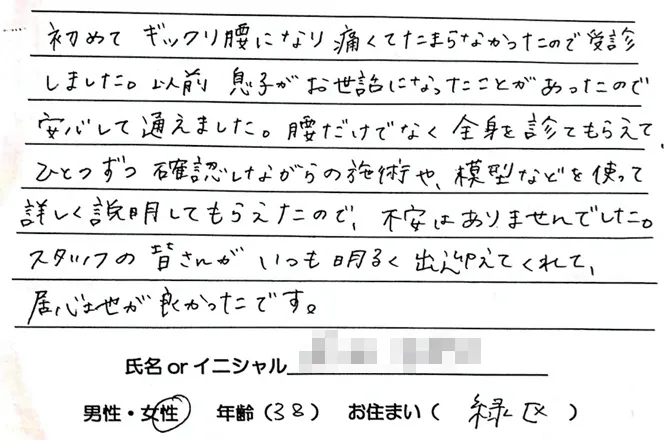 接骨院が初めてで、少し不安がありましたが、どの先生もステキな方々で、不安も解消されました。