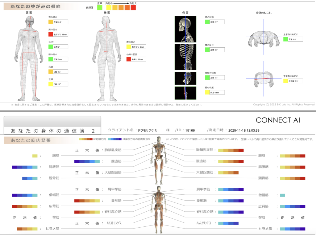 当院では、まず**最新3D AI姿勢分析機器「connectAI」**を用いて、お体の状態を客観的にデータ化します。