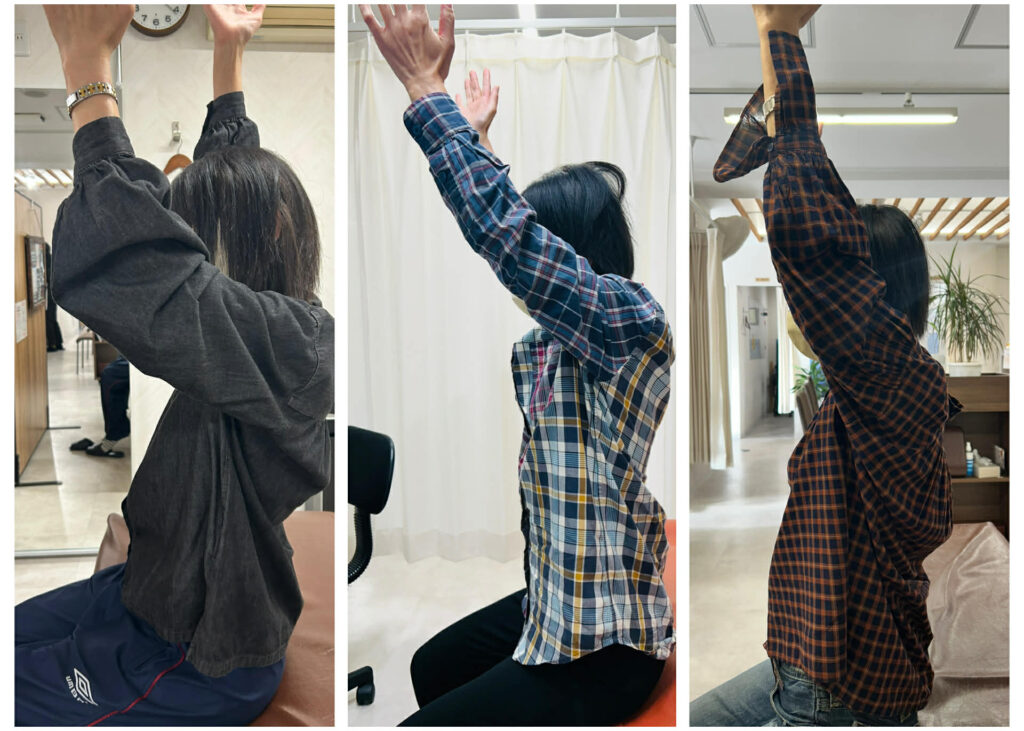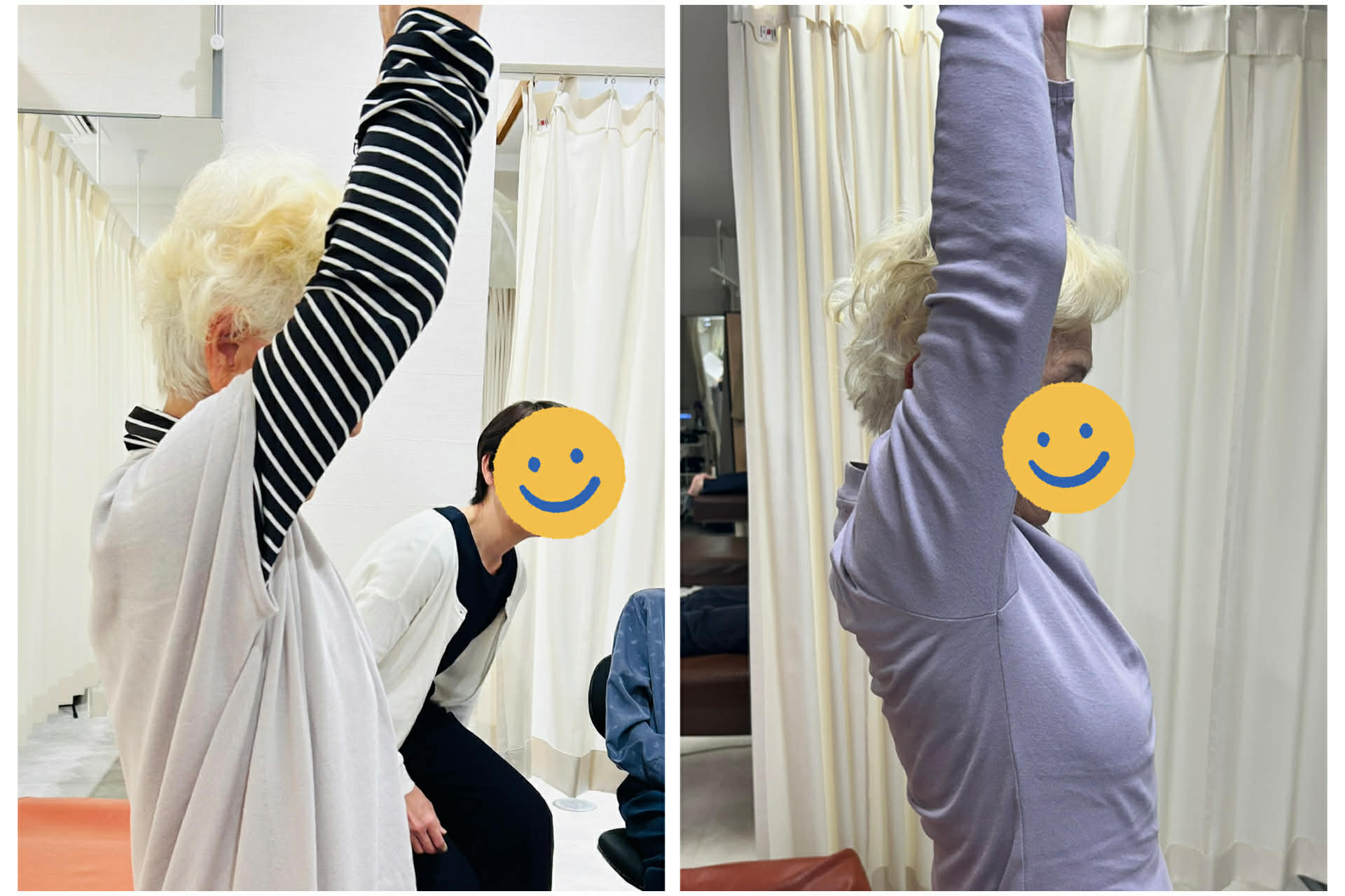 月に1〜2回のペースで通っていただき、7回目を迎える頃には、制限のあった左肩の動きがスムーズになり、写真でもはっきりと分かるほど改善が見られました。