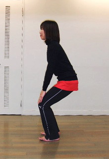 腰を曲げないよう上半身を垂直に保ち、なるべく腰を曲げない体勢でしゃがもうとしていました。